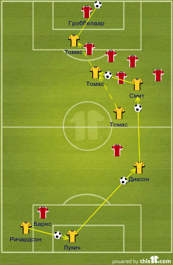 «Арсенал летит вперёд, и это, конечно, его последняя атака. Хорошая передача Диксона Смиту, пас на Томаса, Томас тащит его через середину поля. Томас, ну же!».