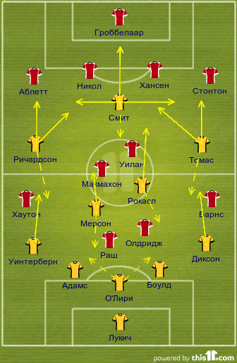 Схема, которую использовал Джордж Грэм в первом тайме заключительного матча Первого дивизиона сезона 1988/1989 годов (5-4-1).
